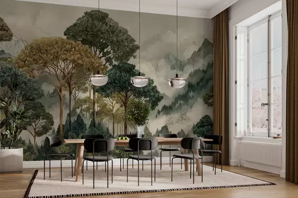 Forest with tall trees in misty mountains - Wall mural (No. w05410)