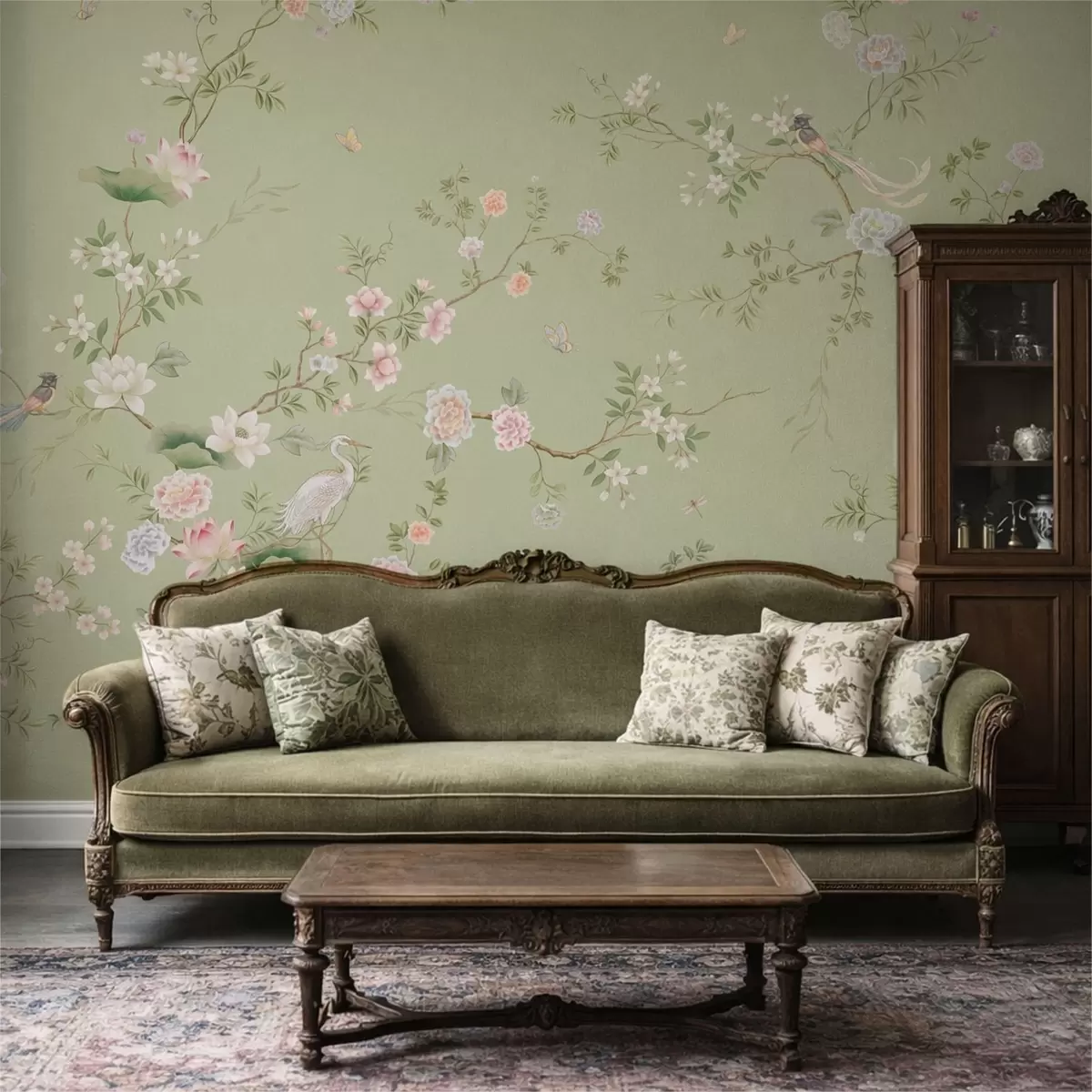 Flowering branches with birds on light green - Wall mural (No. w05416)