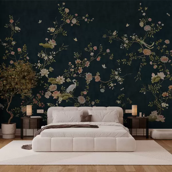 Flowering branches with birds on dark background - Wall mural (No. w05416v3)