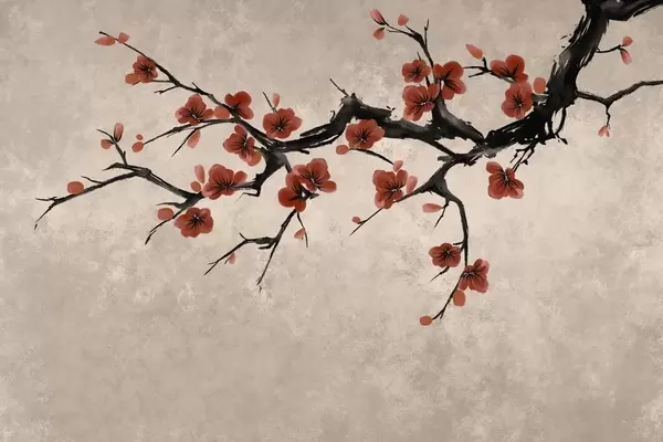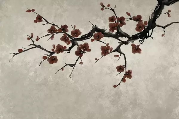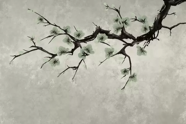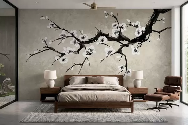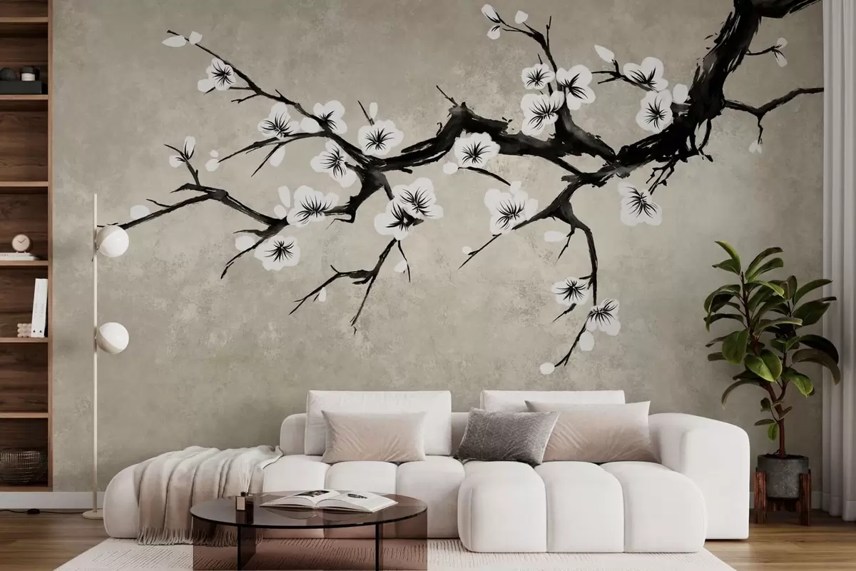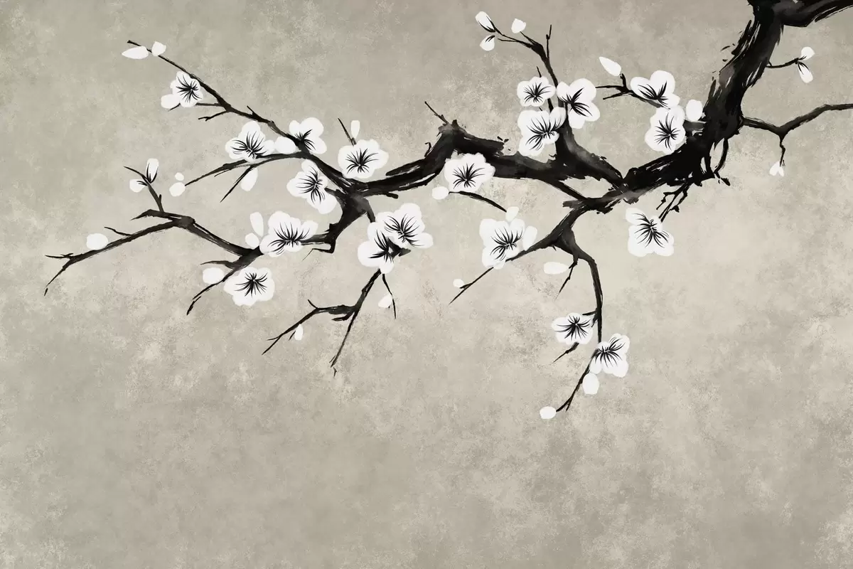 Branch with white blossoms in minimalist style - Wall mural (No. w05425)