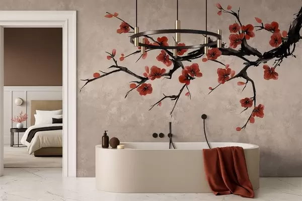 Blossom branch in eastern style on beige background - Wall mural (No. w05425v4)