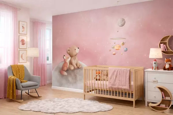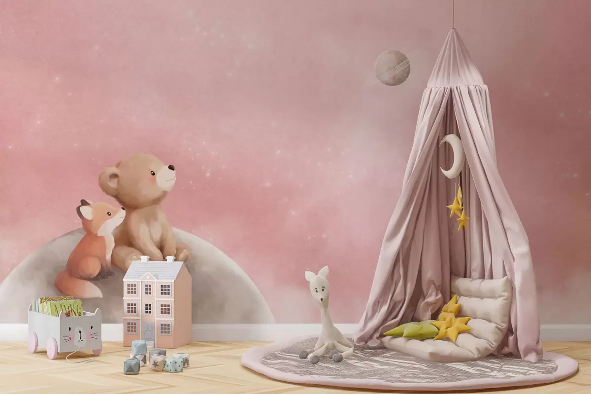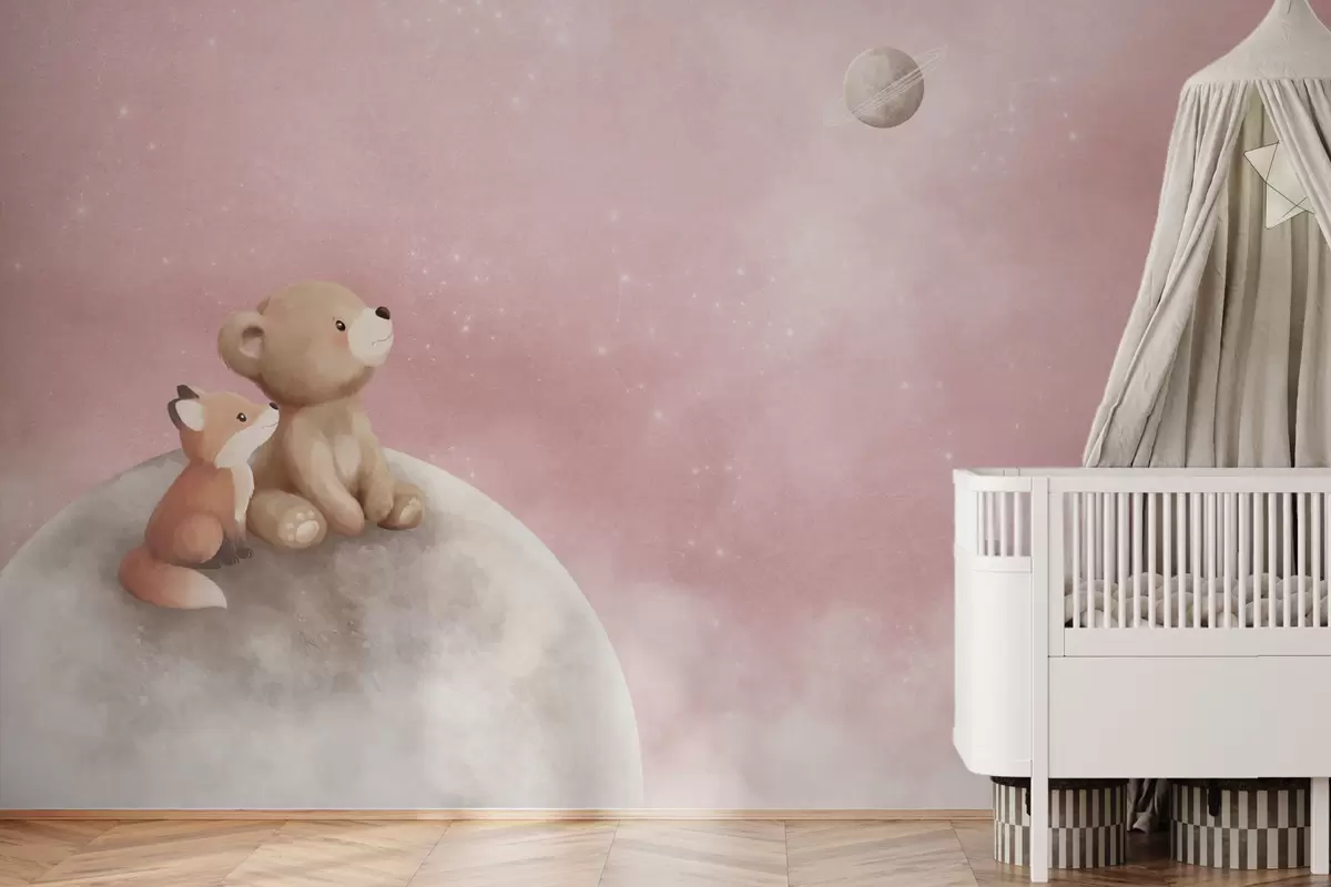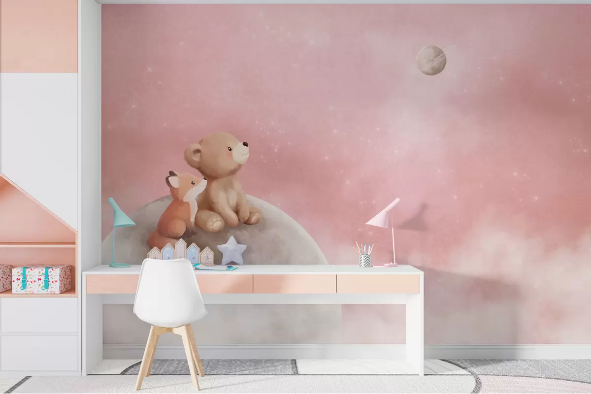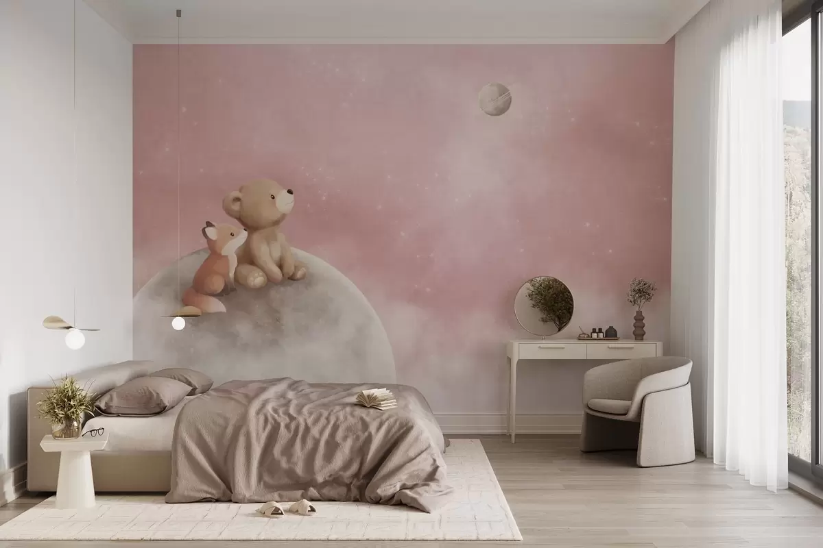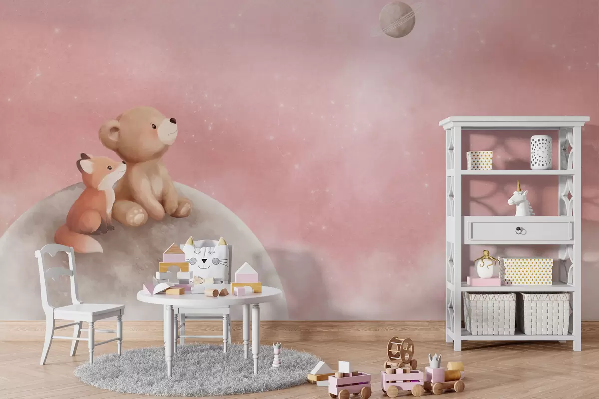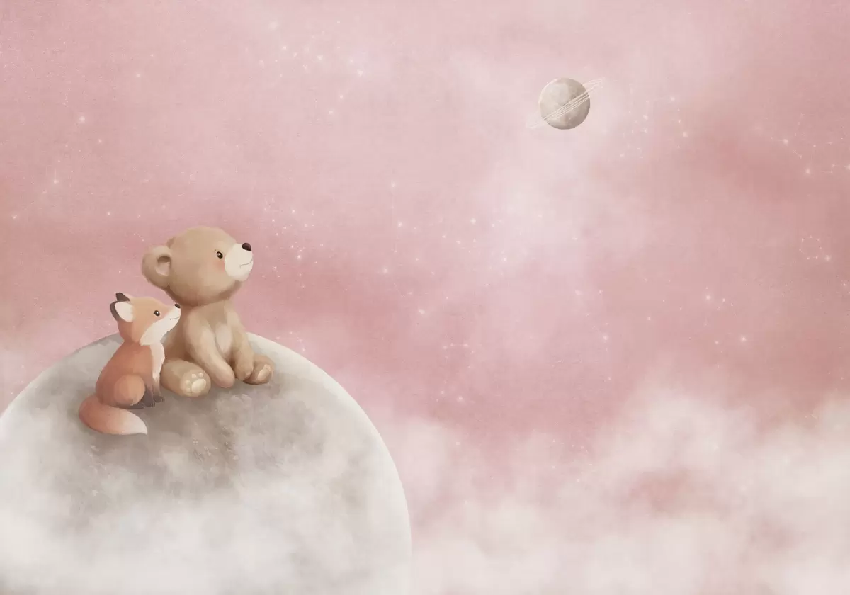 Pastel illustration bear and fox on moon pink sky - Wall mural (No. w05431v2)