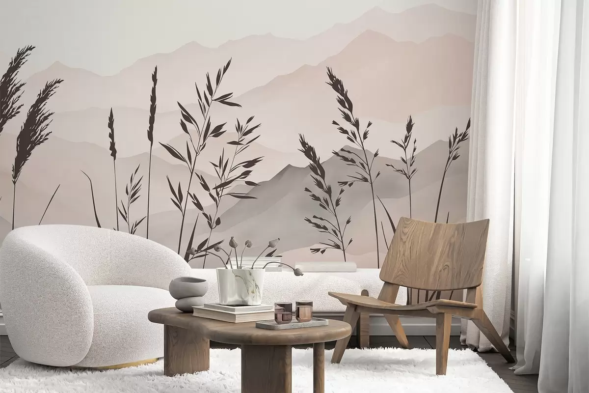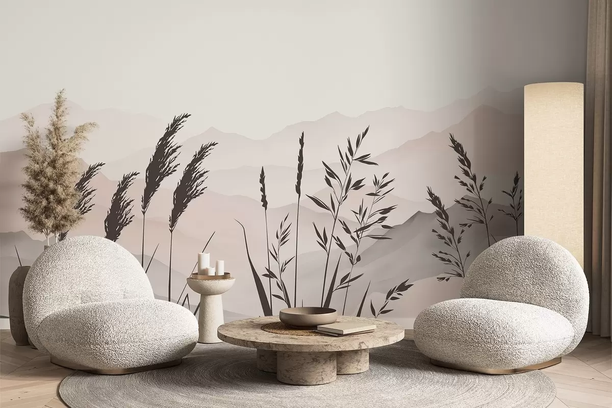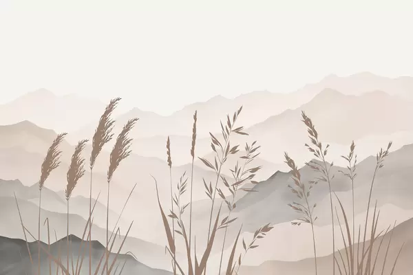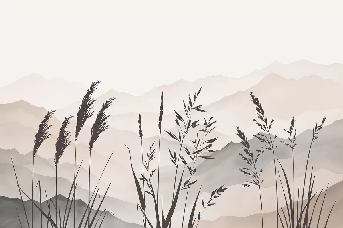 Silhouettes of grass against the backdrop of mountains - Wall mural (No. w05501)