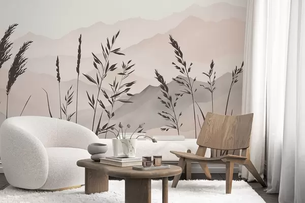 Silhouettes of grass against the backdrop of mountains - Wall mural (No. w05501)