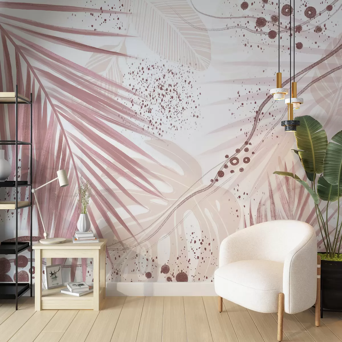 A tropical pink palm leaves and fronds, with abstract shapes and splatters in shades of pink and white - Wall mural (No. w07918v1)