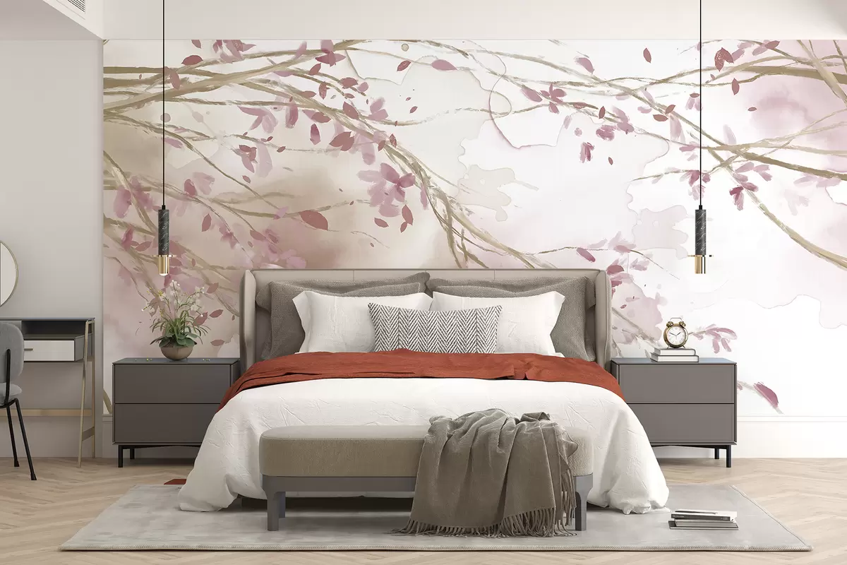 Delicate pink and white floral branches with soft, blurred watercolor background - Wall mural (No. w07919v1)