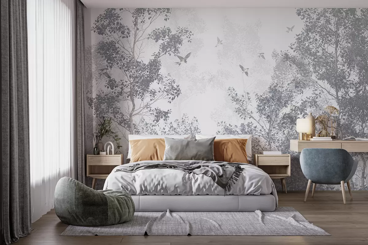 Trees with gray leaves and branches with birds flying in the sky, white background - Wall mural (No. w07982v1)