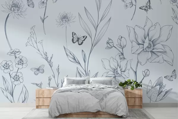 Boho Monochrome Flowers and Butterflies in blue - Wall mural (No. w08088v2)
