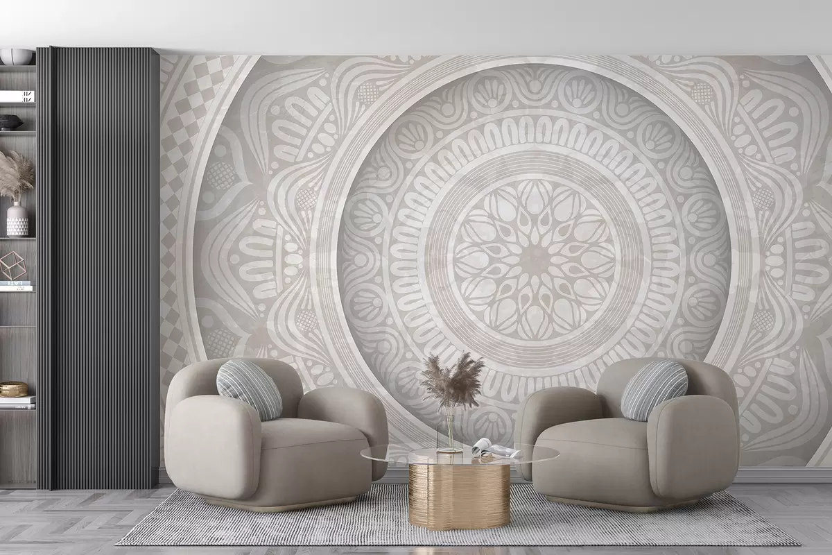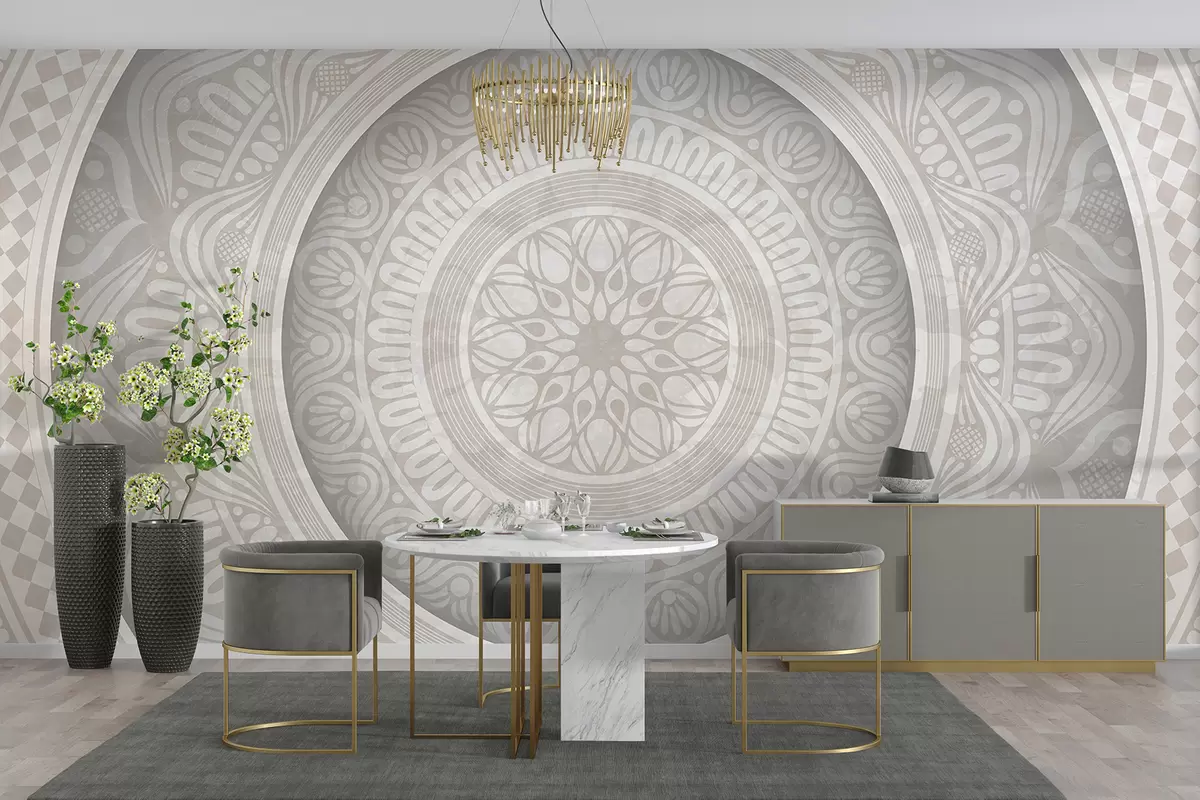 A detailed symmetrical gray and white mandala print with concentric circles and geometric shapes - Wall mural (No. w08182)