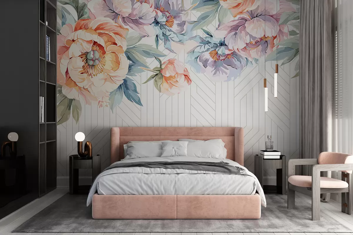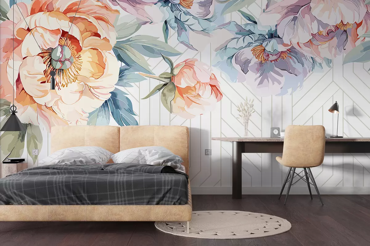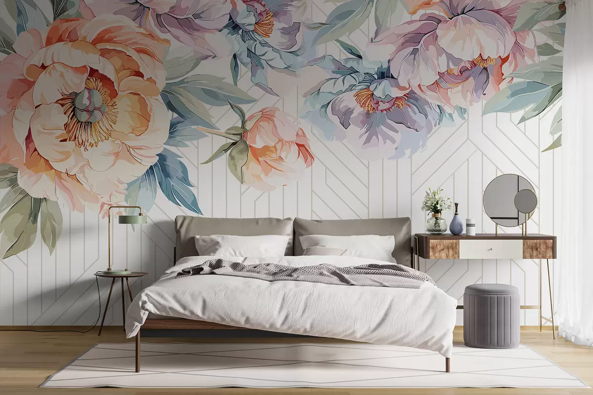 Vibrant peach and pink abstract peonies with green leaves against a white and gray pattern background - Wall mural (No. w08183)