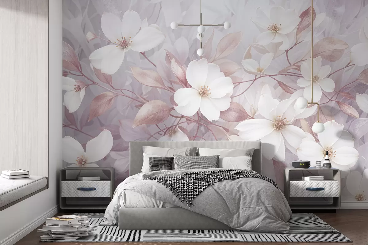 Delicate pink and white magnolia flowers blooming on soft, blurred branches against a pale background - Wall mural (No. w08196)