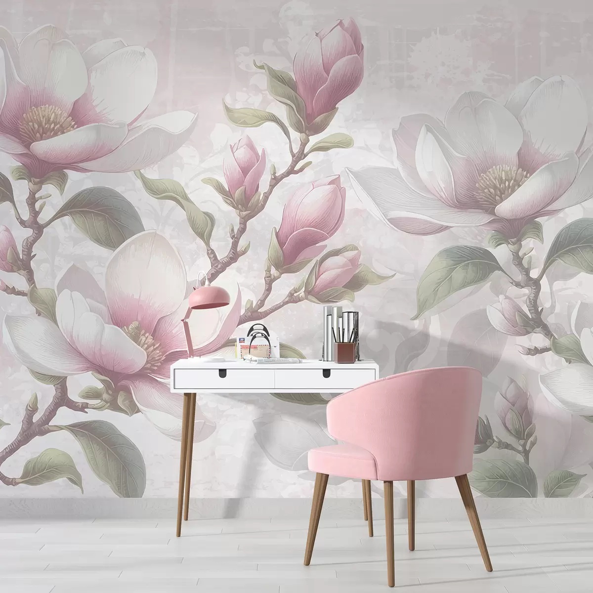 Delicate pink magnolia flowers in full bloom against a soft, blurred background - Wall mural (No. w08216)