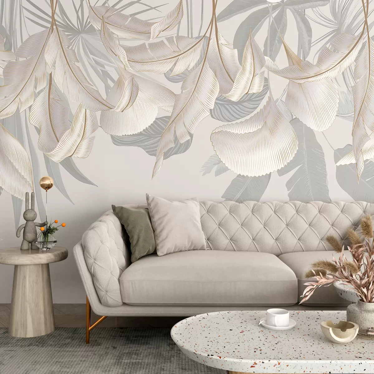 Delicate white and gray floral tropical leaves creating a soft, ethereal background - Wall mural (No. w08217)