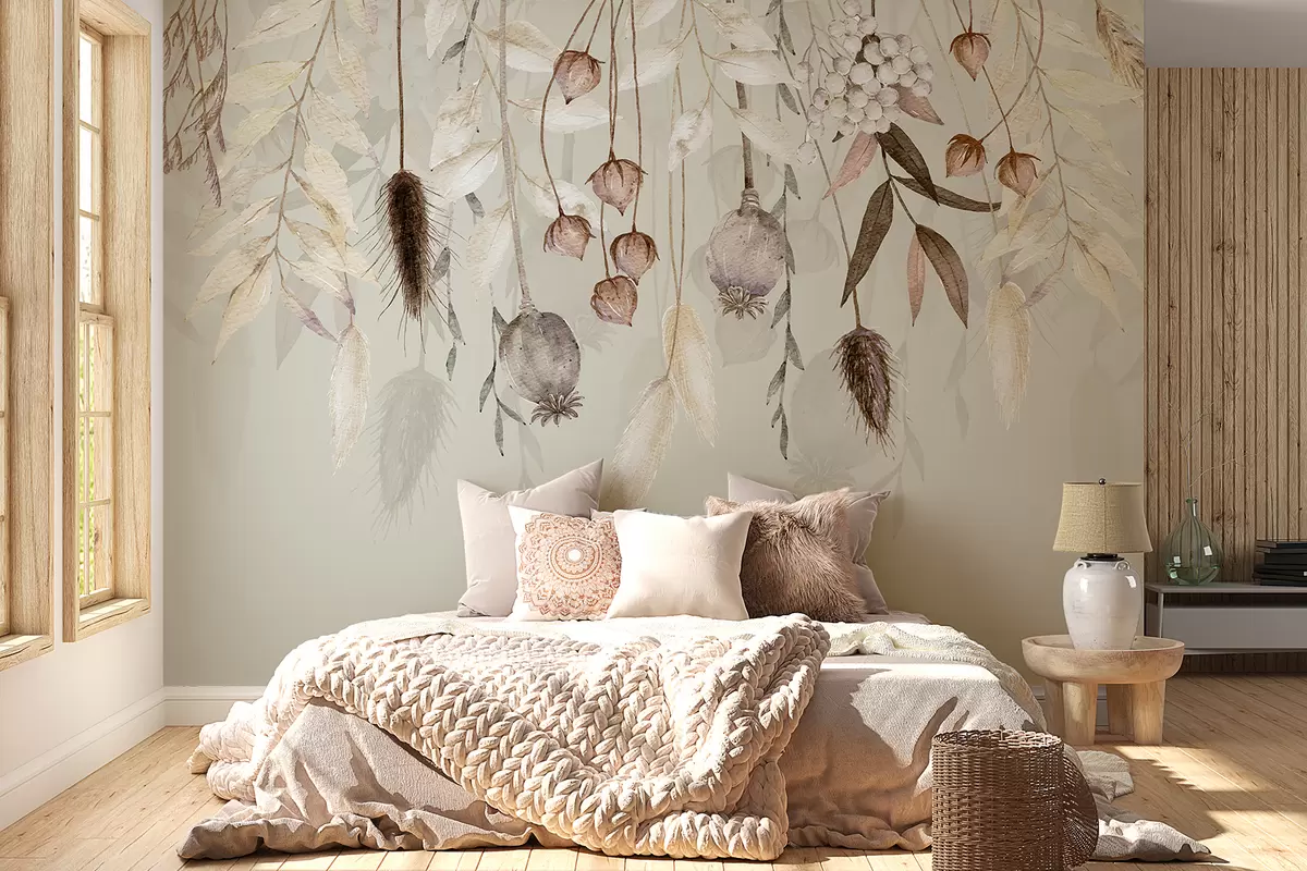 Delicate floral arrangement with dried flowers, leaves, and feathers hanging against a soft background - Wall mural (No. w08230)