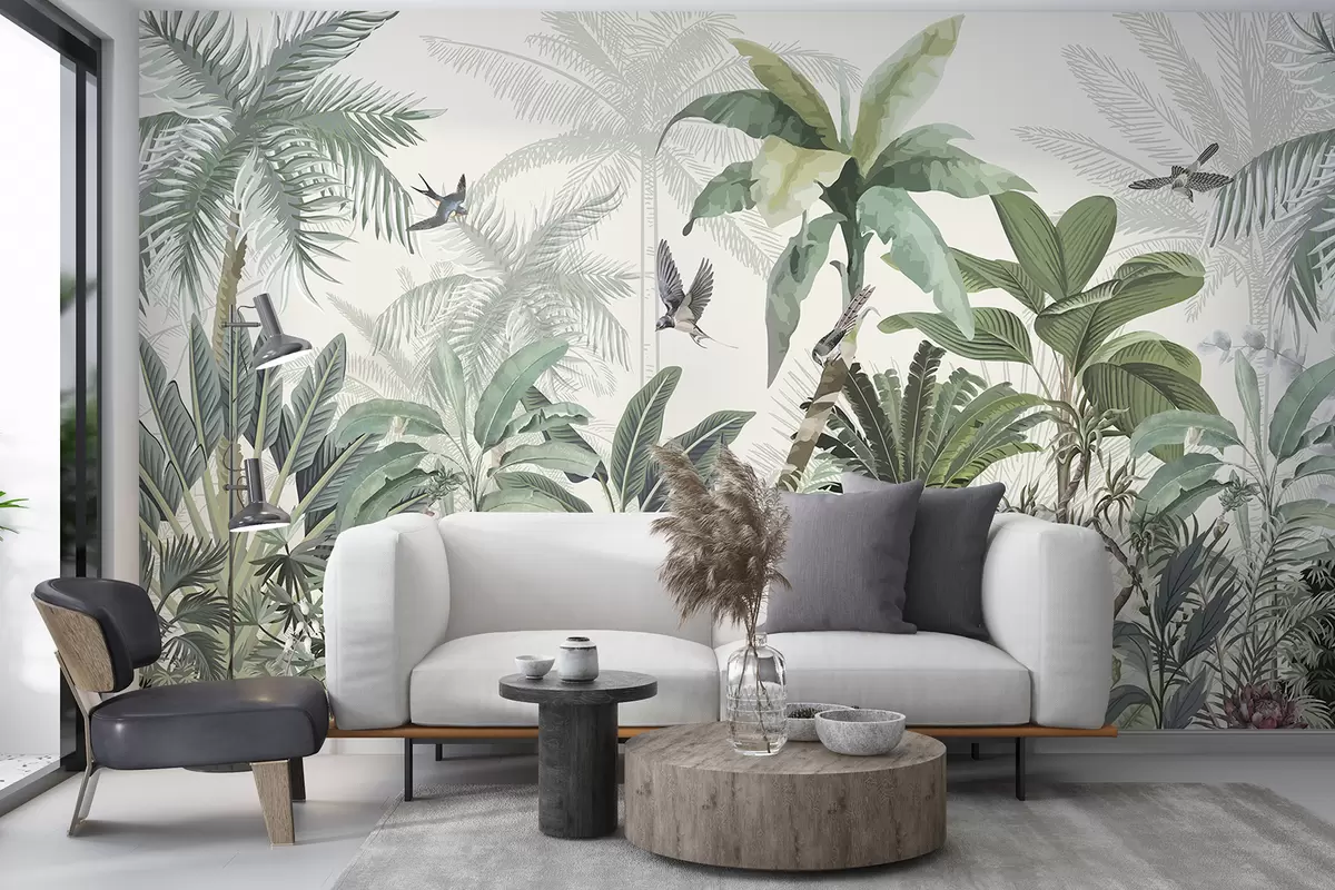 A lush tropical jungle scene with various palm trees, large leaves, and colorful flowers in the foreground - Wall mural (No. w08239)