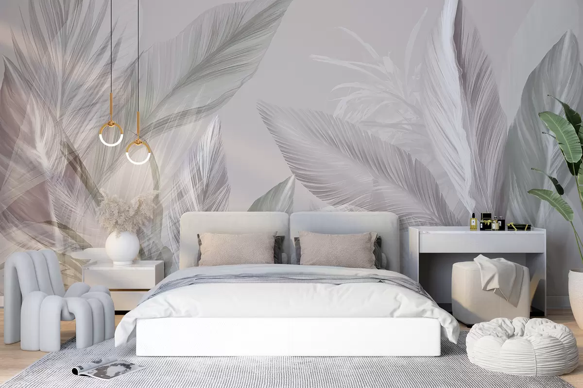 Soft white, pink and gray feathers and tropical leaves floating against a light background - Wall mural (No. w08241v1)