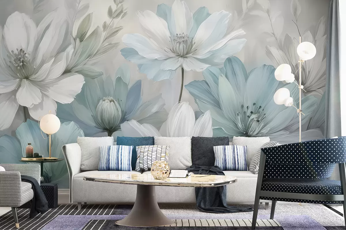 A close-up of white and light blue daisy-like flowers painting art with soft, blurred backgrounds - Wall mural (No. w08247)