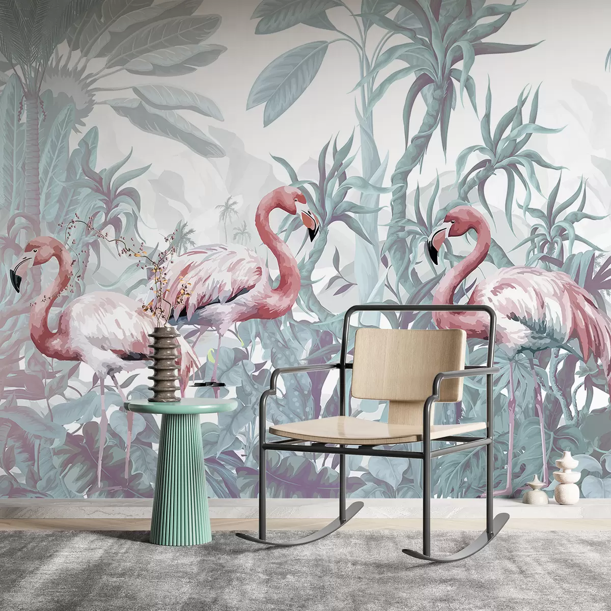 Pink flamingos standing in a lush, tropical foliage with large palm leaves and flowers in shades of green and white - Wall mural (No. w08250v1)