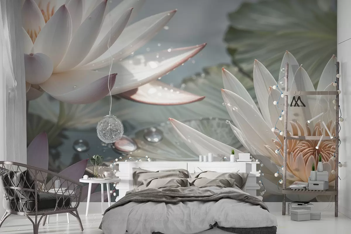A close-up of white lotus flowers with water droplets on their petals against a blurred green background - Wall mural (No. w08252)