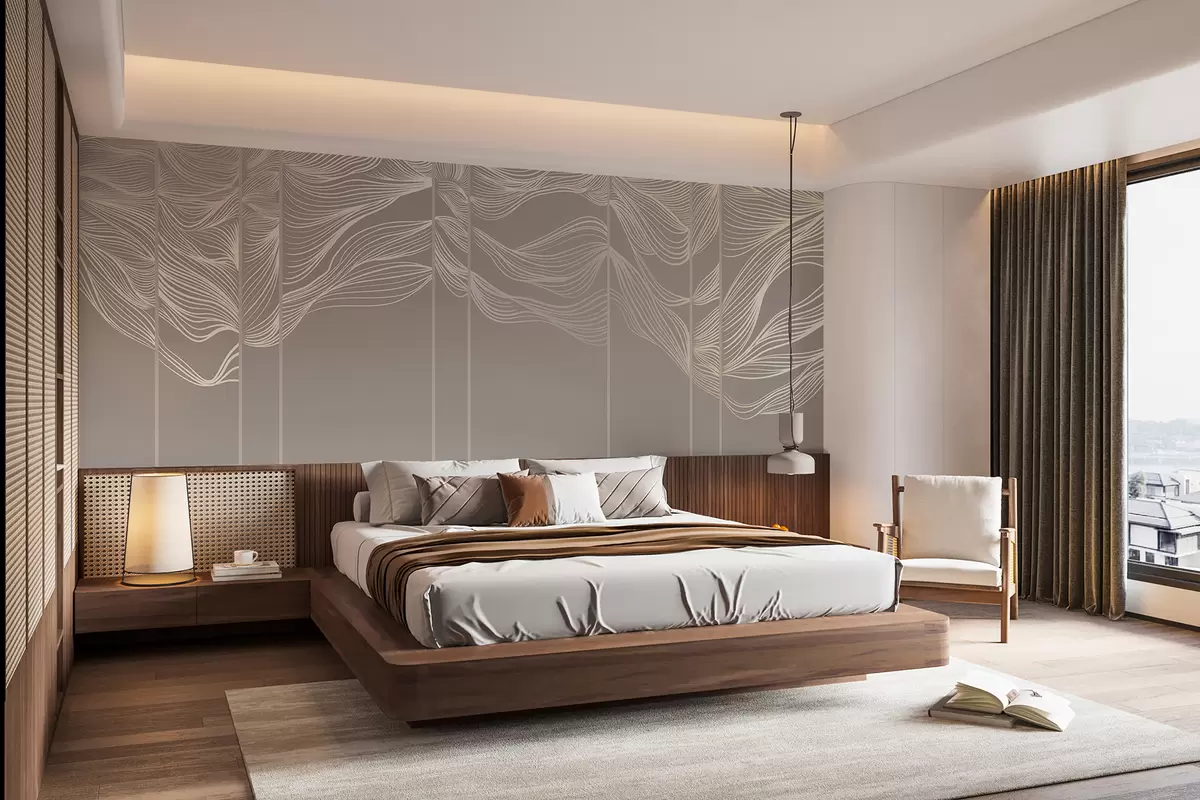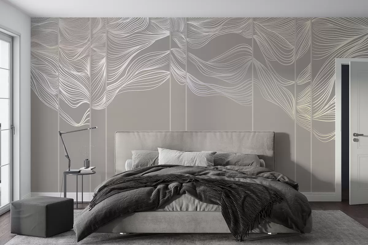Flowing white abstract line waves against a light brown background - Wall mural (No. w08263)
