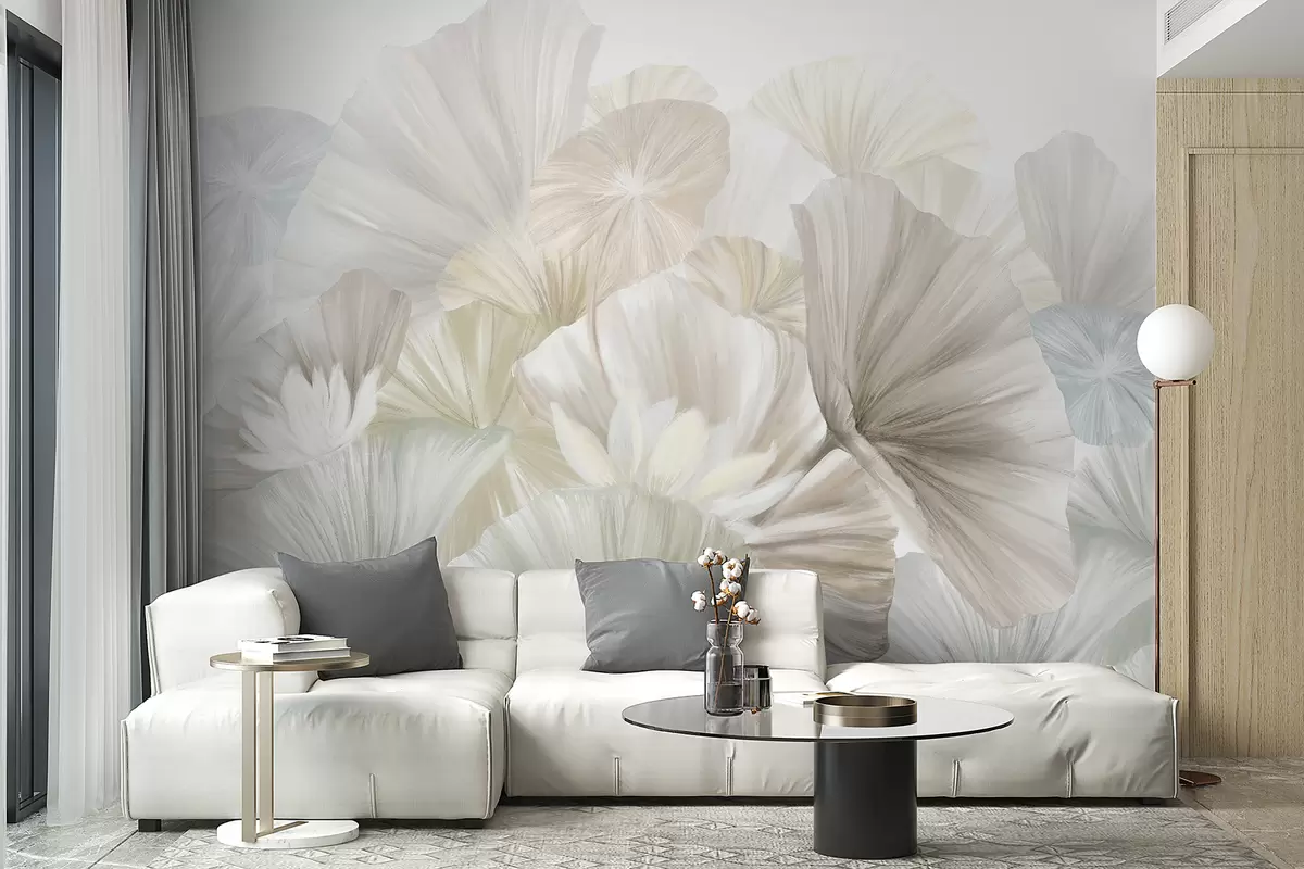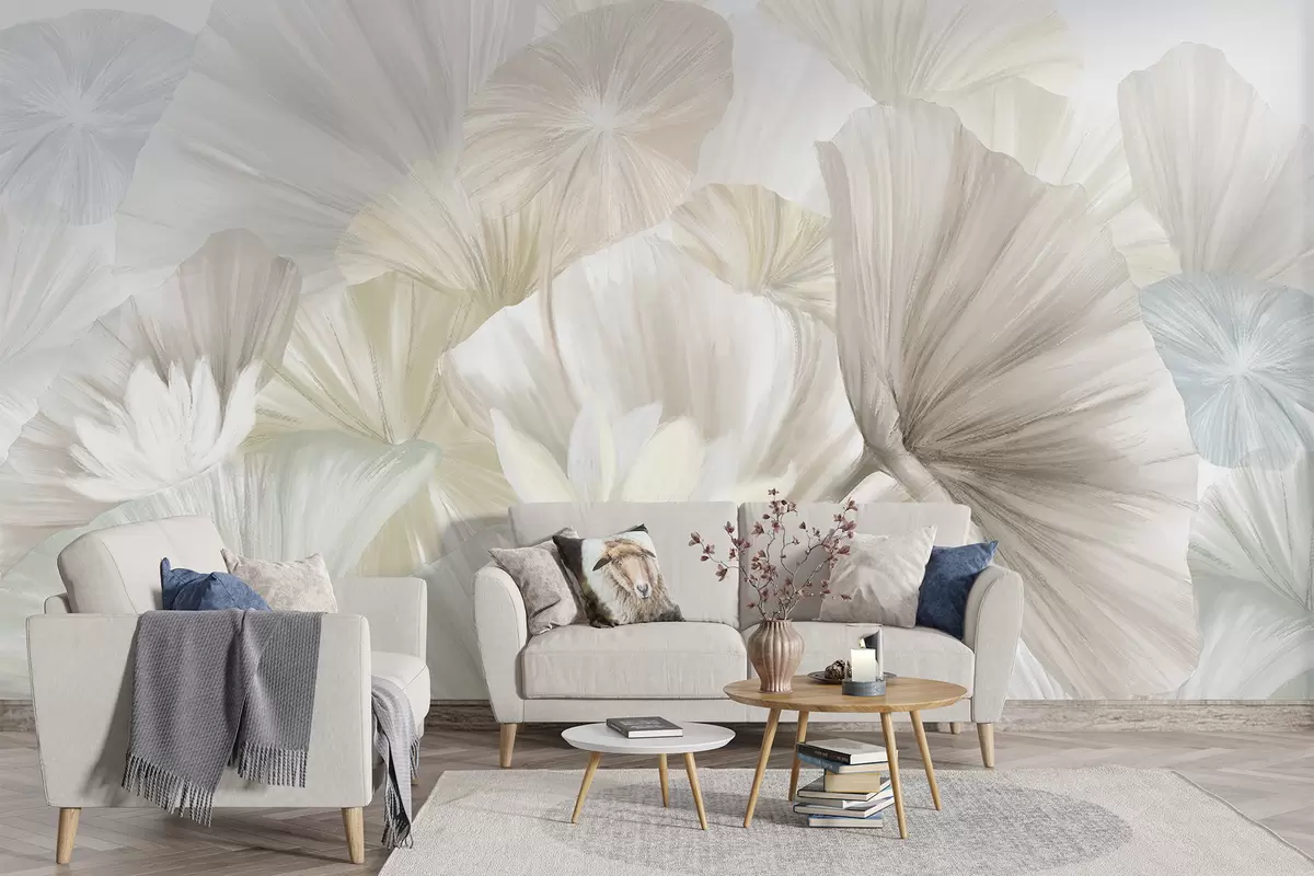 Delicate green lotus leaves with white flowers with soft, feathery petals arranged in a natural art composition - Wall mural (No. w08265)