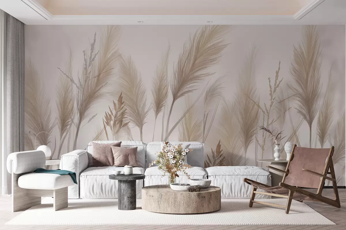 Tall beige grass blades spikelets swaying in the wind against a soft, light background - Wall mural (No. w08268)