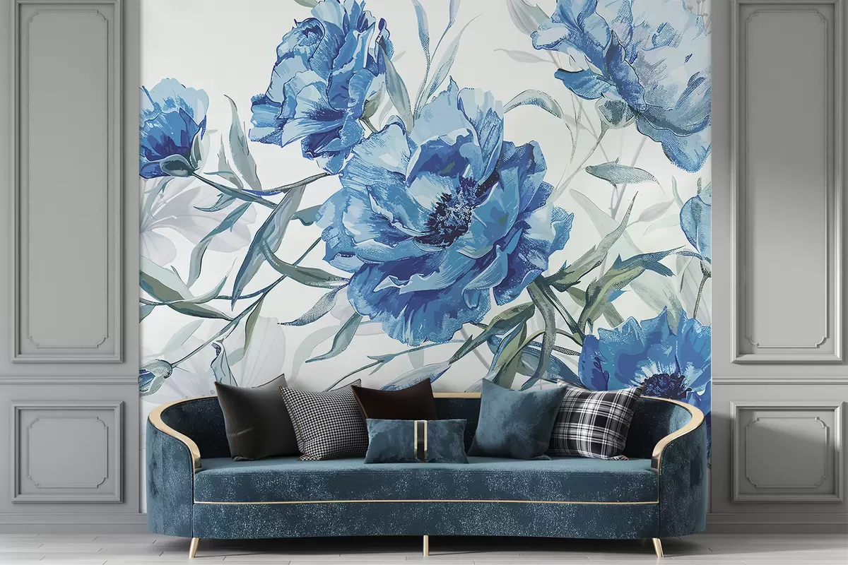 wall murals Blue peonies painting with lush foliage against a light abstract background  w08274v1