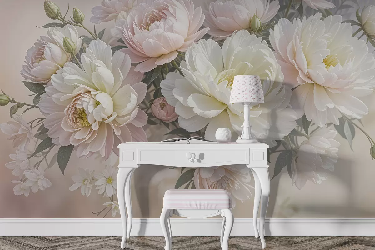 A bouquet of lush, pastel-colored peonies and other flowers against a soft, blurred background - Wall mural (No. w08276)