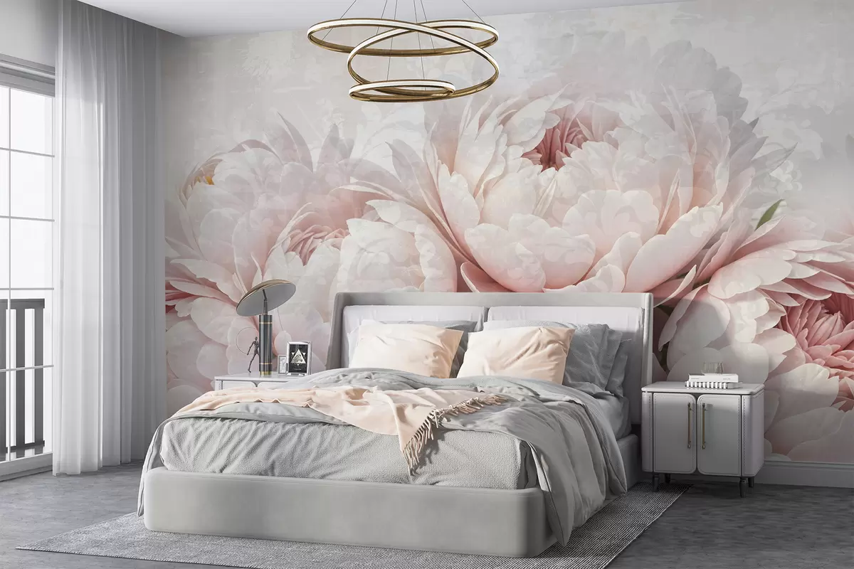 Soft pink peonies with delicate petals against a light textured vintage background - Wall mural (No. w08312)