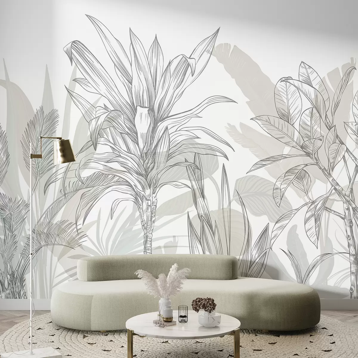 A tropical graphic plants with large, lush leaves and flowers in shades of gray and white with floral green silhouettes - Wall mural (No. w08327)