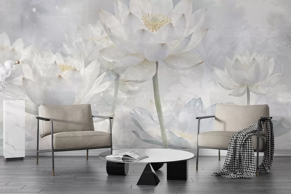 White lotus flowers in a misty, ethereal abstract pastel landscape background - Wall mural (No. w08328)