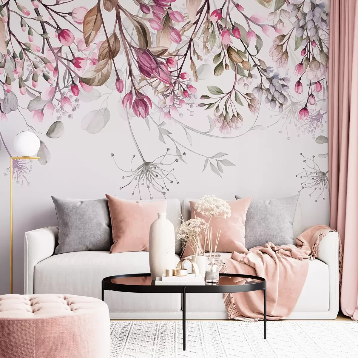 Delicate pink and white floral branches with leaves and petals, on pastel gray background - Wall mural (No. w08347)