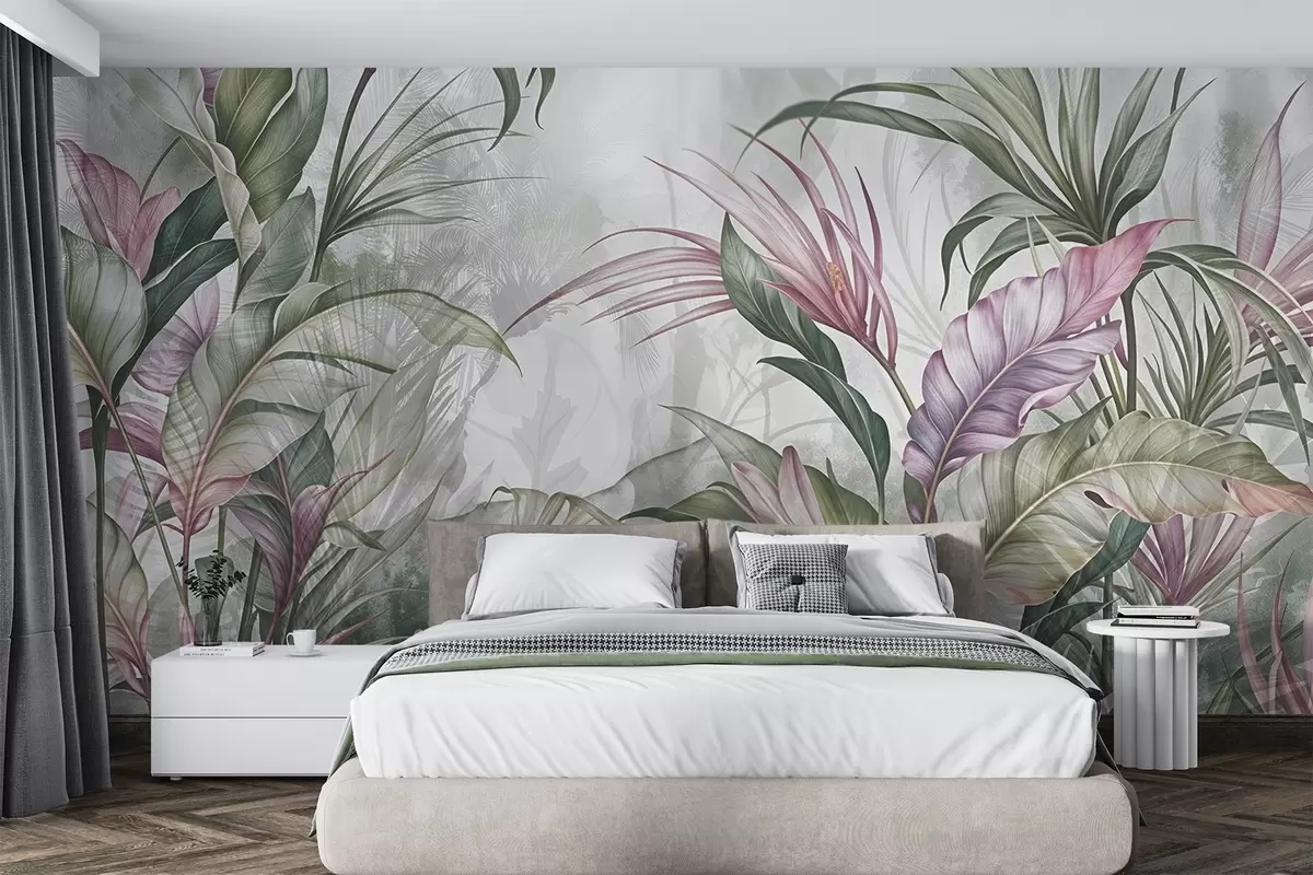 Tropical jungle with large green leaves and pink protea flowers with blurred textured background - Wall mural (No. w08375)