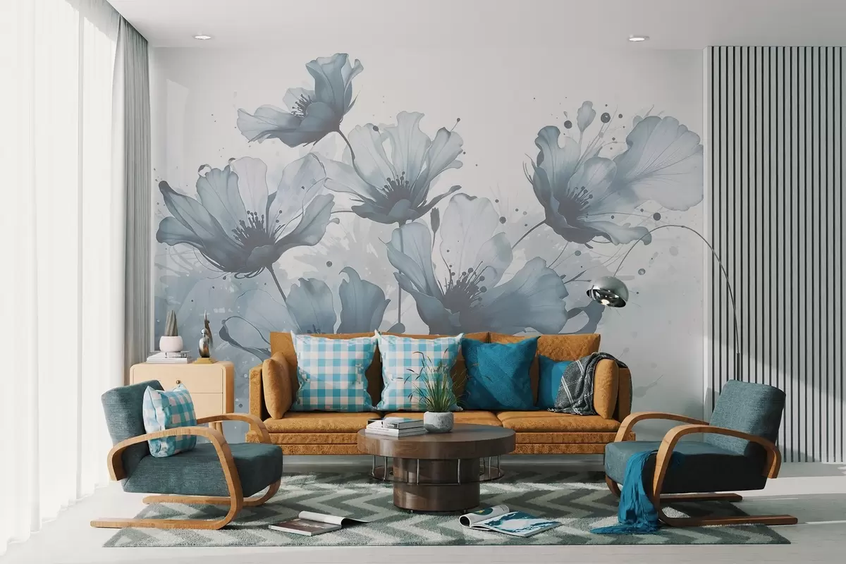 Delicate blue flowers with soft, blurred petals and watercolor splashes against a light background - Wall mural (No. w08376)