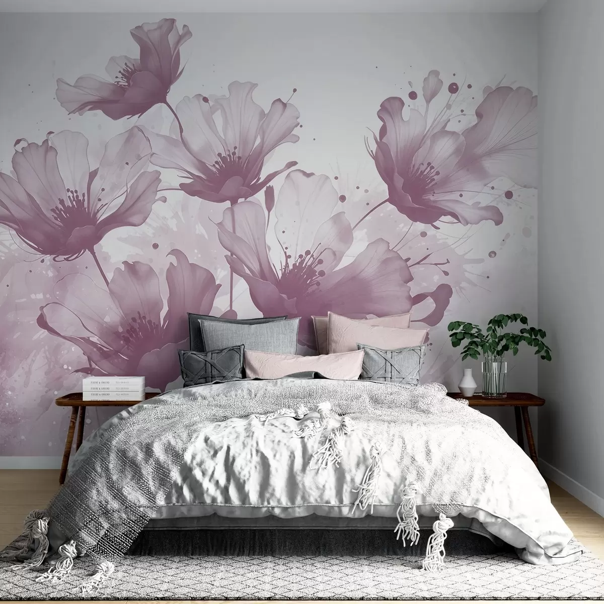 Delicate pink flowers with soft, blurred petals and watercolor splashes against a light background - Wall mural (No. w08376v2)