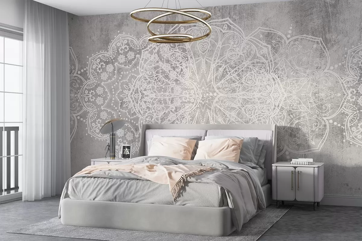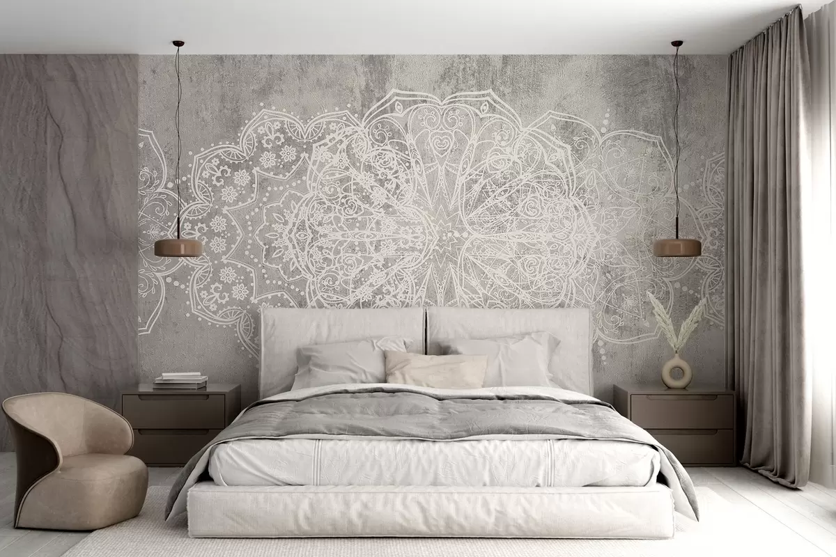 A detailed, intricate white lace mandala pattern on a textured loft gray wall background - Wall mural (No. w08387)