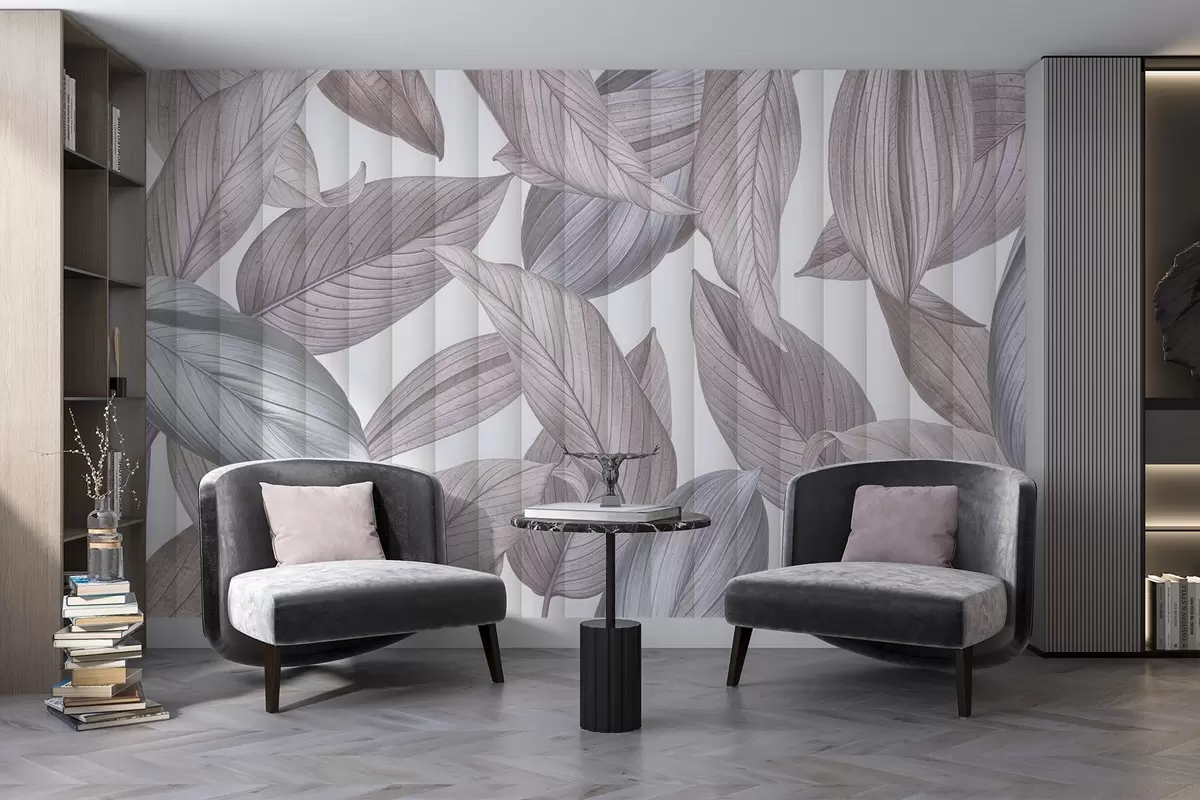 Abstract detailed leaves in shades of blue, gray, and pastel pink on a light background - Wall mural (No. w08388v1)
