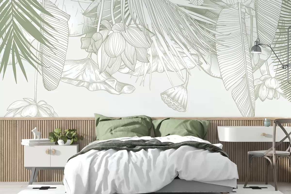 wall murals A close-up view of a green floral print with large, overlapping petals and leaves in a monochrome color w08389v1