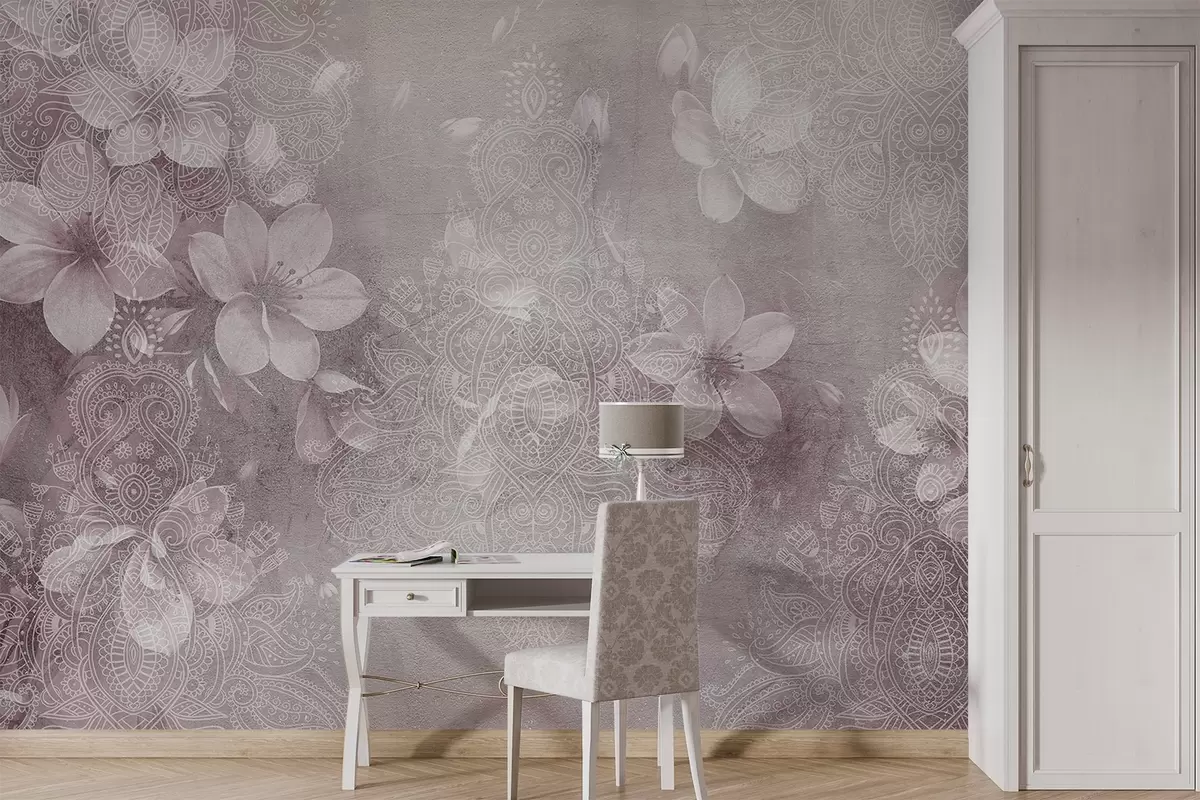 Soft focus drawing of delicate white flowers on a blurred textured lace bordo background - Wall mural (No. w08405v2)
