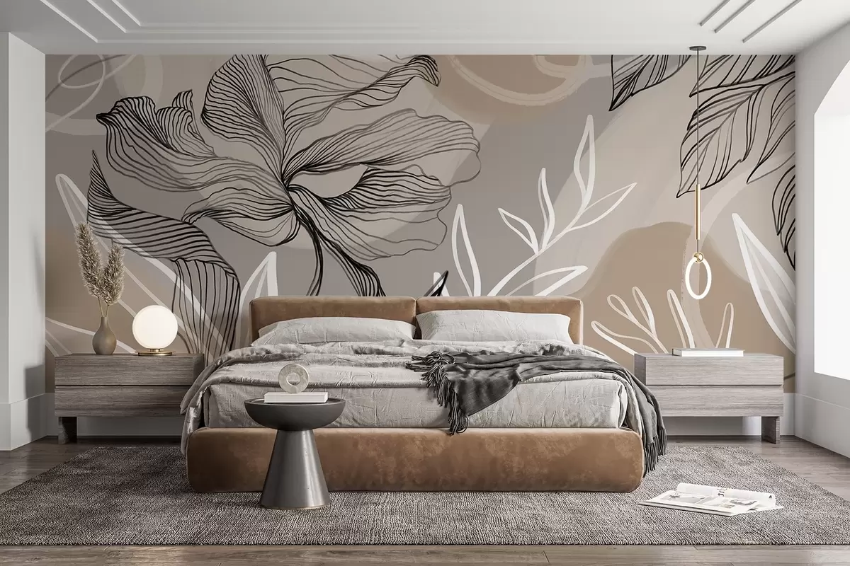 Elegant floral print with large abstract line flowers and leaves in shades of gray and beige on a light background - Wall mural (No. w08413)