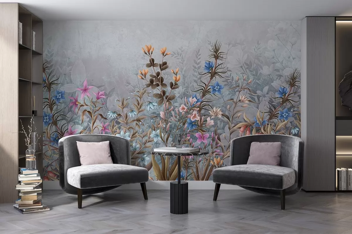 A lush, vibrant floral textural print with colorful flowers and plants with intricate details and textures - Wall mural (No. w08428)