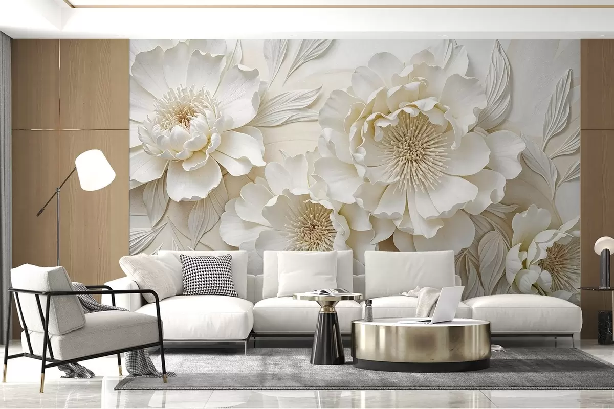 Elegant volumious imitation white peony flowers with soft petals and pastel yellow centers, against a light background - Wall mural (No. w08431)