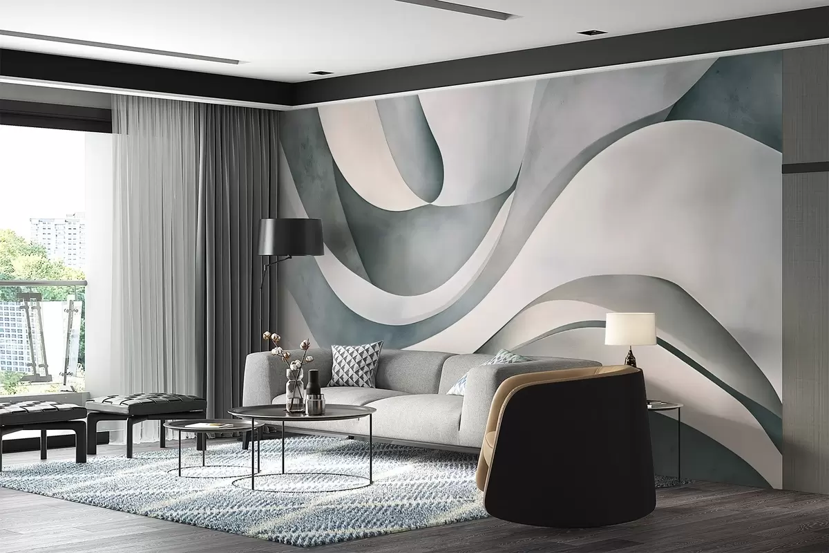 White, blue and gray curved shapes and forms , creating abstract textural modern minimalistic print - Wall mural (No. w08439v1)