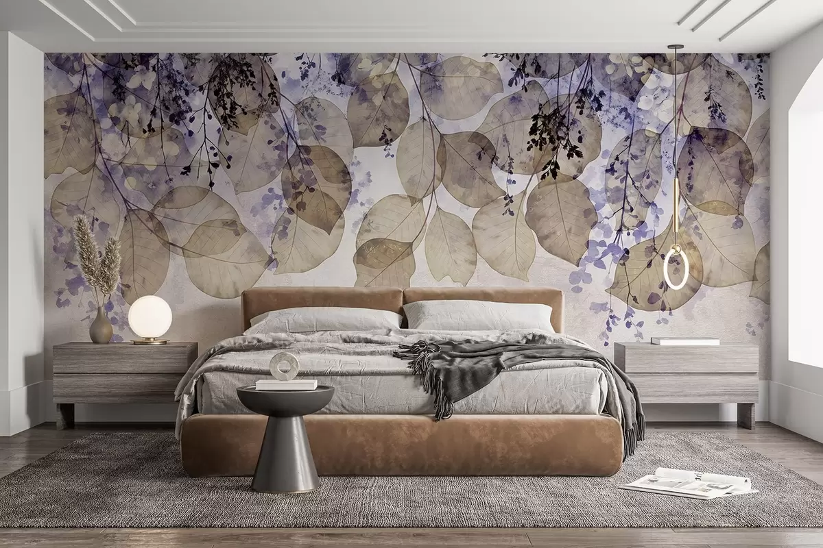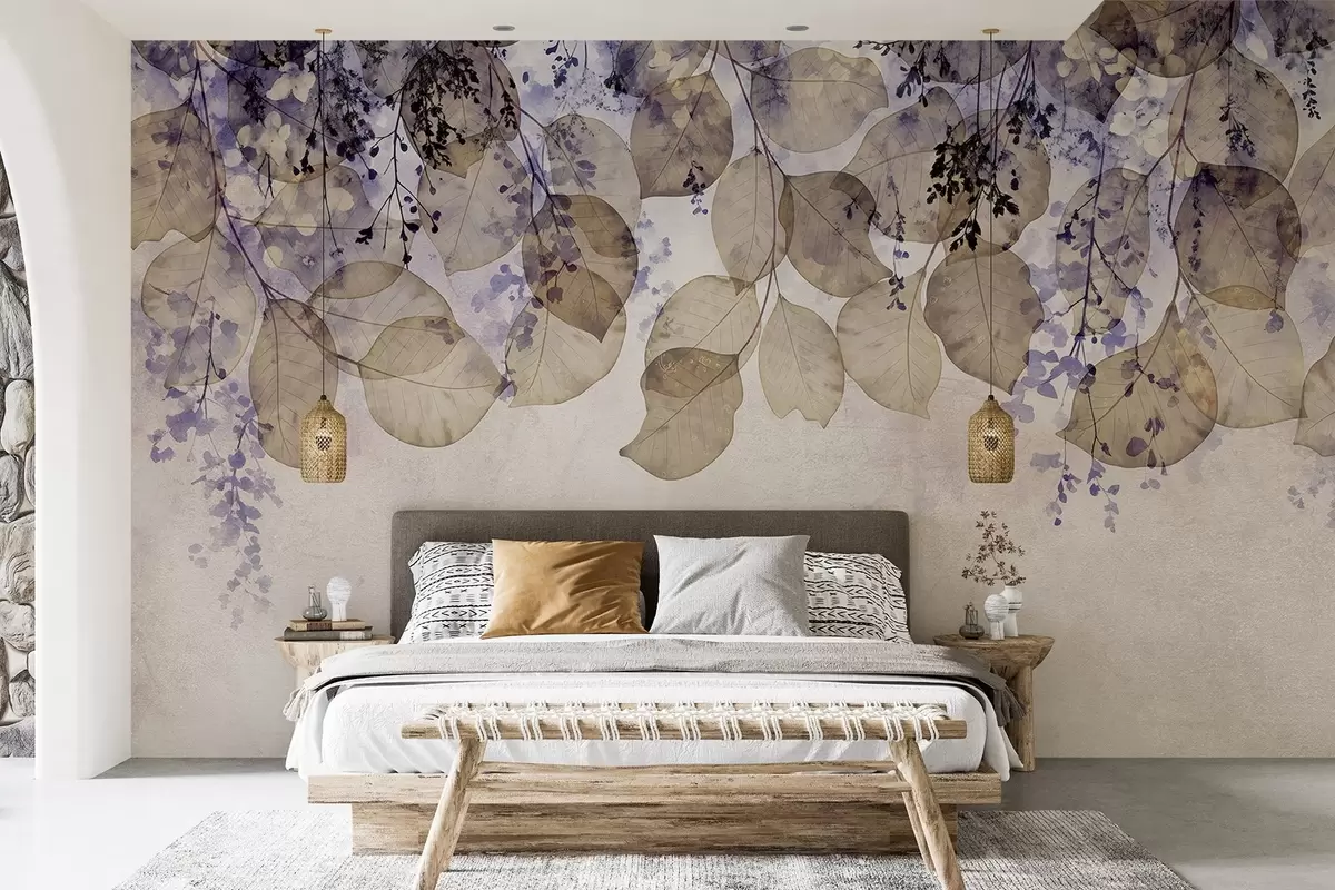 Delicate dried leaves and florals in shades of purple, beige and white against a light textural background - Wall mural (No. w08447)
