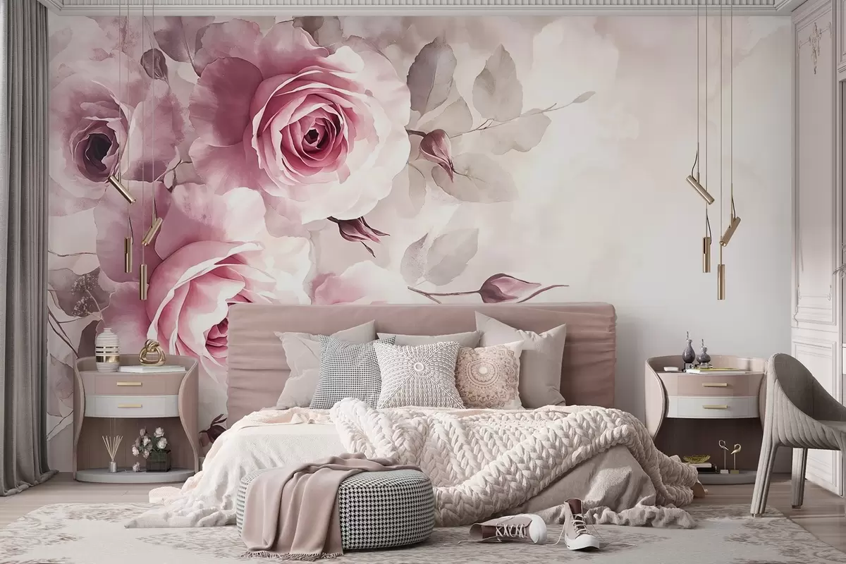 Delicate pastel pink roses and leaves with soft, blurred watercolor imitation background - Wall mural (No. w08459)
