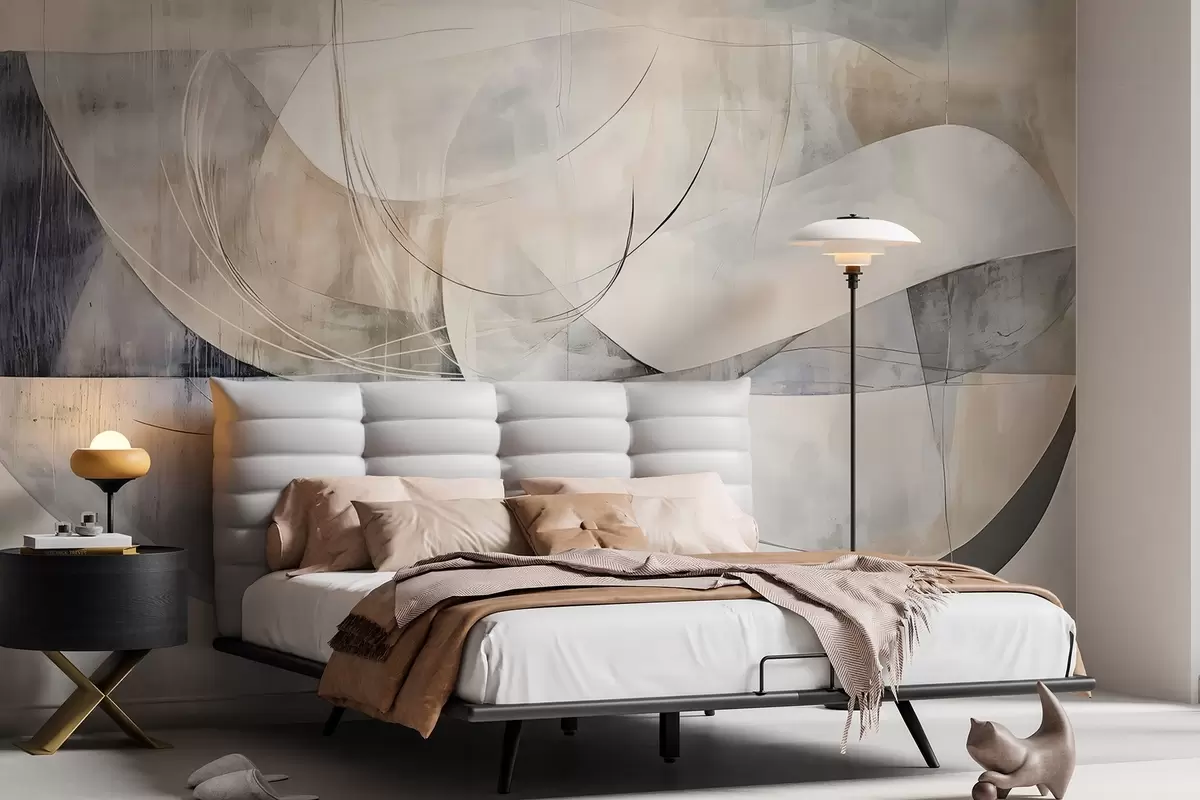 Abstract shapes and forms in shades of white, gray, beige and blue against a blurred textured background - Wall mural (No. w08461)