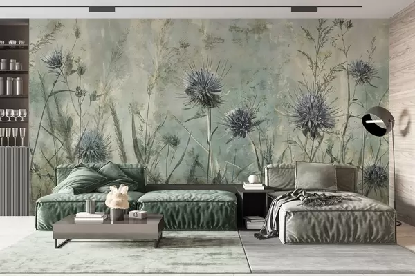 A field of purple thistle flowers with blurred flowers and foliage in the vintage textural background - Wall mural (No. w08463)