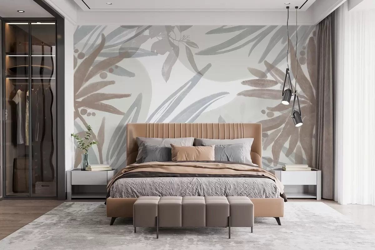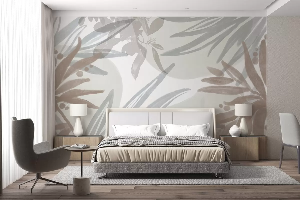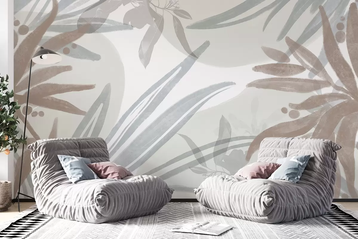 A neutral-toned abstract floral pattern with overlapping leaves and shapes in shades of gray , white , and beige - Wall mural (No. w08464)