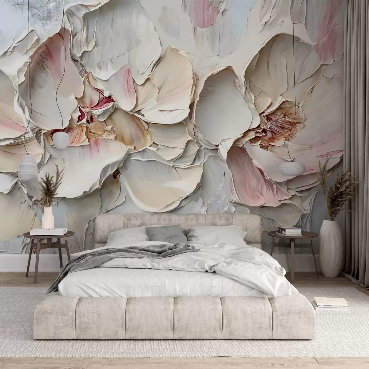 wall murals Delicate, pale pink flowers with soft, layered petals on a muted, textured background impasto oil painting imitation w08467