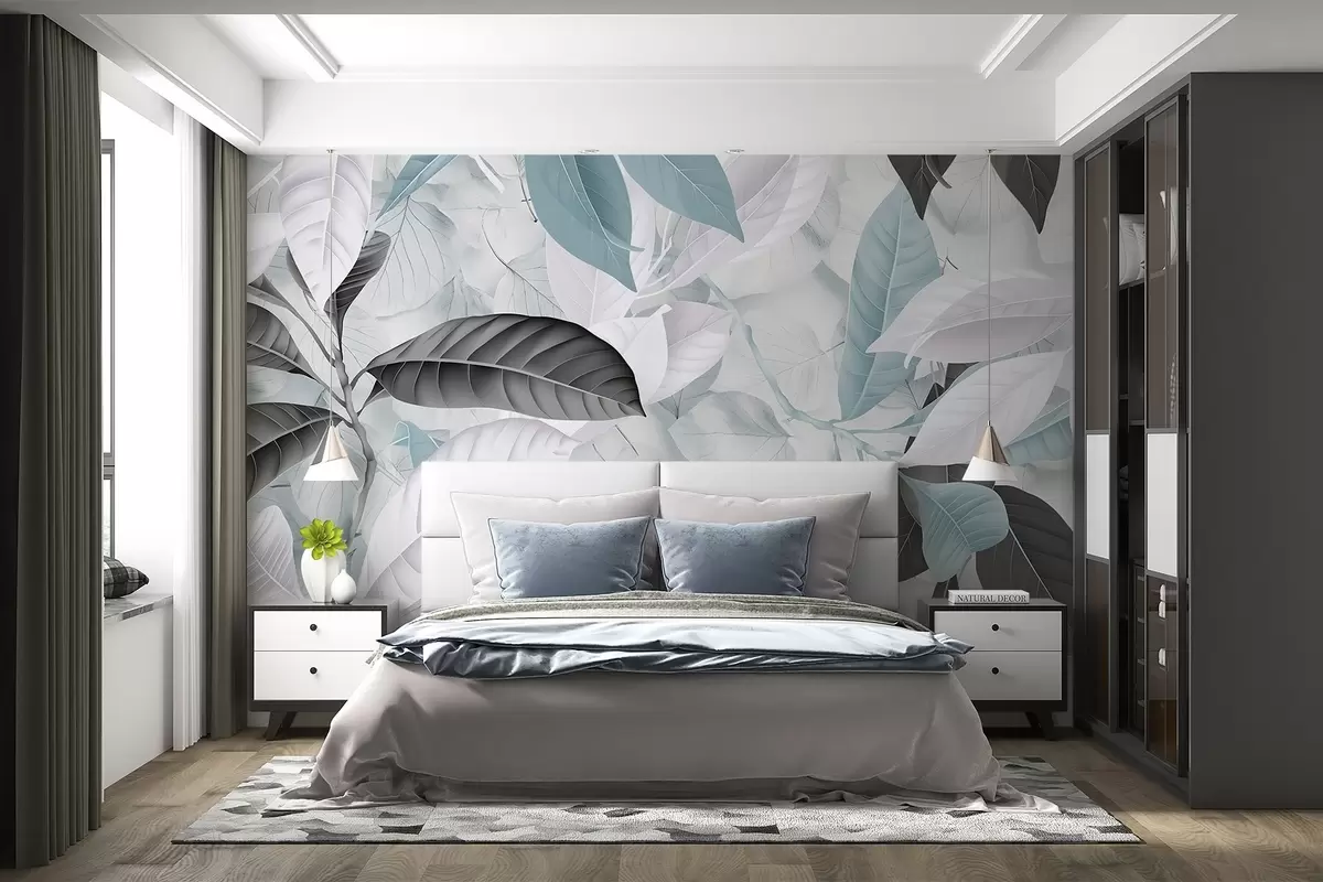 Large print of blue and gray leaves against a light leaves textured background, creating a lush tropical feel - Wall mural (No. w08468v1)